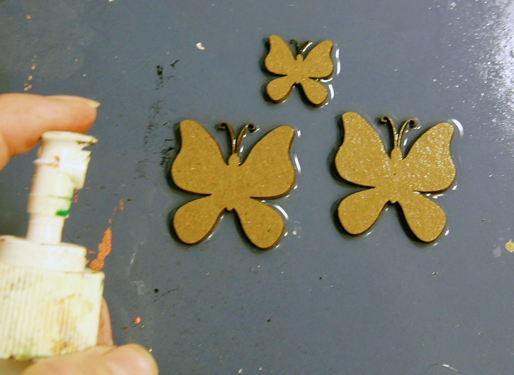 Step 3: While the chipboard is still wet curl up the edges of the butterflies, then dry with a heat gun. The heat gun will help the edges curl a little more too.
