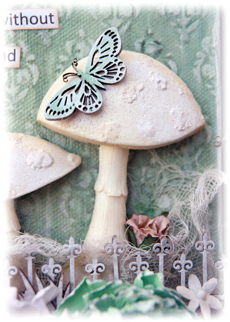 I have used the Mushroom Moulds on this canvas, they are so cute and whimsical, I have used a white dabber paint over these then inked with a soft beige chalk ink.